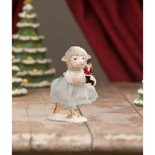 Clara Lamb ballerina poses artfully while displaying her nutcracker for all to see. She is dressed in a sheer light blue and white fabric gown and wears gold metallic ballerina slippers. This specialty piece will be a treasure brought out for display every Christmas.