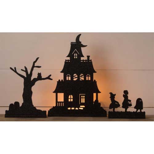 Turn your mantle into a spook-tacular Halloween scene with these silhouettes! It features a large tree with an owl and tombstones, a terrifying haunted house with broken windows and a crescent moon, and 3 small children in their Halloween costumes! Each silhouette has it's own stand! Place a battery operated candle behind the scene for a light up look (candle not included). Sold as a set of 3. Made by Bethany Lowe. Made of MDF. Dimensions: House: 19.5" X 13.5" X 1.75", Children: 6.25" X 8.25" X 1.75", Tree: 14" X 9.25" X 1.75".