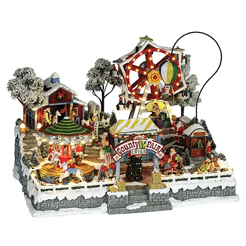 The Country Christmas Fair is a very large country scenescape. It includes 3 animated pieces, a ferris wheel,carousel and balloon ride. Santa gives free balloons to the children, there are horses to ride, food kiosks and clowns.