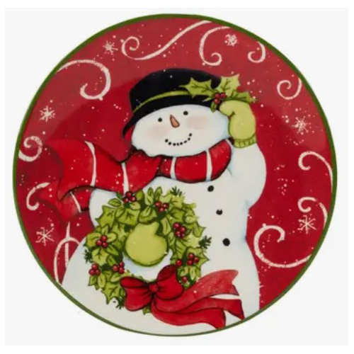 Snowman Canape Plates. Set of 4, Part of the Holiday Magic Collection. 6 inches Materials: Earthenware Dimensions: 15x15x1
