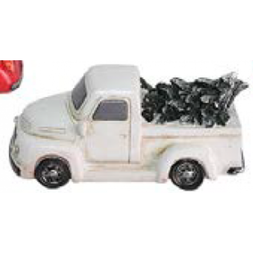 White pick-up truck with Christmas tree on top Lighted headlights, battery operated, not included 11.4 x 7.6cm Village sized