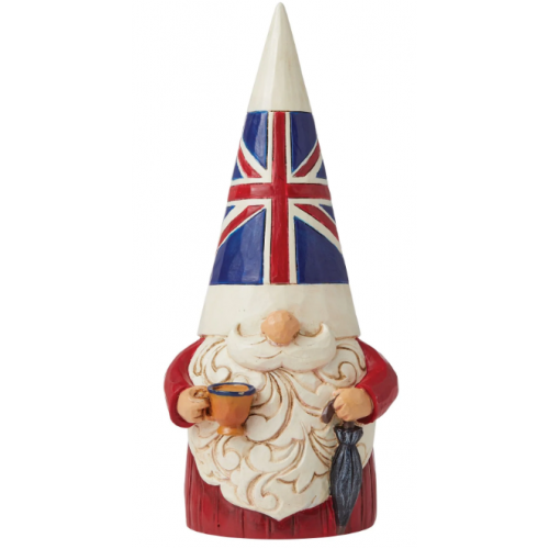 Jim Shore's Gnomes Around the World collection is a whimsical celebration of symbols and customs from nations near and far. The British Gnome holds a jaunty umbrella and cup of tea while wearing a hat decorated with the Union Jack. im Shore's unmistakable style evokes a sense of nostalgia with traditional themes, quilt patterns and design motifs inspired by American and European Beautifully hand-painted and crafted from high-quality stone resin with intricate styling and attention to detail. 5.5" Tall