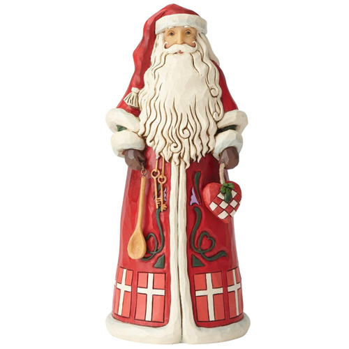 im Shore's Santas Around the World collection celebrates Christmas traditions far and wide. Danish Santa holds a decorative heart, ladle, and keys. Whimsical rosemaling details his robe, prominently trimmed with the flag of Denmark. "Jolly Julemanden" figurine from the Jim Shore Heartwood Creek collection Jim Shore's unmistakable style combines a diverse color palette with designs inspired by folk art forms of quilting, rosemaling and tole painting. Captures Danish Santa in beautiful detail Hand-painted and crafted from high-quality stone resin 7" H