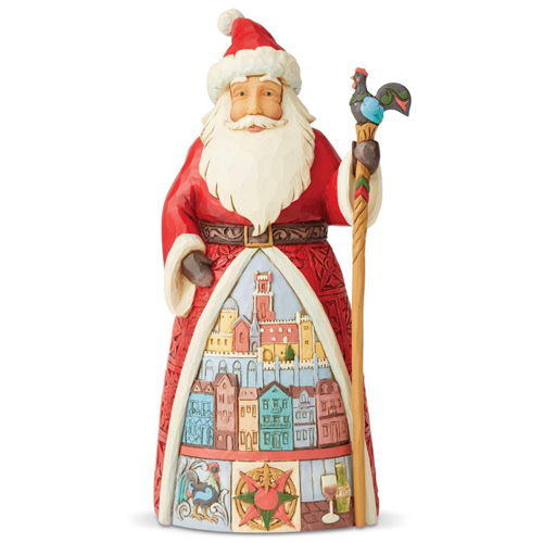 Portuguese Santa celebrates a country of rich culture with many colors. A scene of the painted city is framed by Santa's lavishly textured robe. The Jim Shore Around the World Santa holds a staff topped with an emblem of Portugal, the rooster of Barcelos. Feliz Natal Portuguese Santa celebrates a country of rich culture with many colors. A scene of the painted city is framed by Santa's lavishly textured robe. Hand-painted and crafted from high-quality stone resin. 7.1 in H
