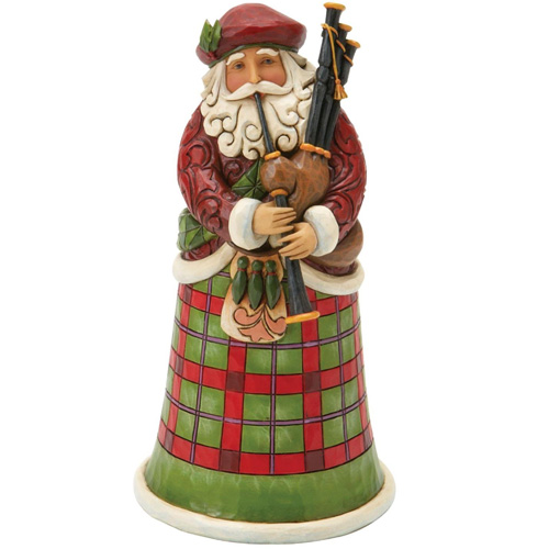A customary Scottish Santa with bagpipes, this is part of Jim Shore's Santas Around The World Collection honoring a specific place with thematic patterns and details. Hand-painted and crafted from high-quality stone resin. 6.75 in H x 3.5 in W x 3.5 in L