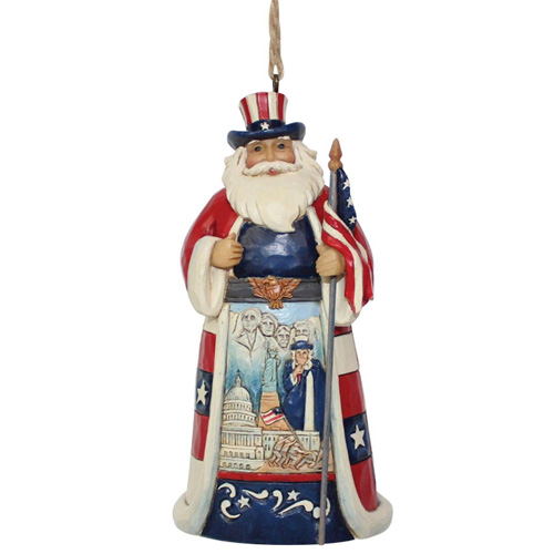 im Shore's Santas Around the World collection shines a light on holiday traditions of cultures near and far. A heartfelt tribute to the spirit of America, Star Spangled Santa features iconic USA symbols, including Mt. Rushmore, Uncle Sam, and more. "American Santa" ornament from the Jim Shore Heartwood Creek collection Jim Shore's unmistakable style combines a diverse color palette with designs inspired by folk art forms of quilting, rosemaling and tole painting. Captures American Santa in beautiful detail Hand-painted and crafted from high-quality stone resin 4.5" H