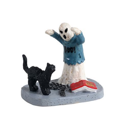 Description: Being a ghost isn't as easy as it seems. Every young ghost has to work on his scare tactics, and this young ghost is no different. As he studies the book on How to be Scary, he decides to put it down and try out his new techniques on the black cat in front of him. We're not sure if this unlucky black cat is scared or just annoyed.