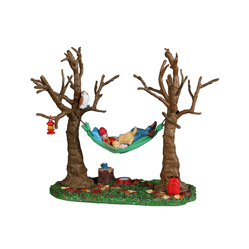 Description: There is something so peaceful about the camping grounds around Vail Village. So peaceful, in fact, that this villager and their dog have decided to take a little nap. In the Camping Hammock Buddy tableau, the swinging bed has been set up between two trees and it looks comfortable and inviting. Even the owl in the tree looks like they are ready for a snooze!