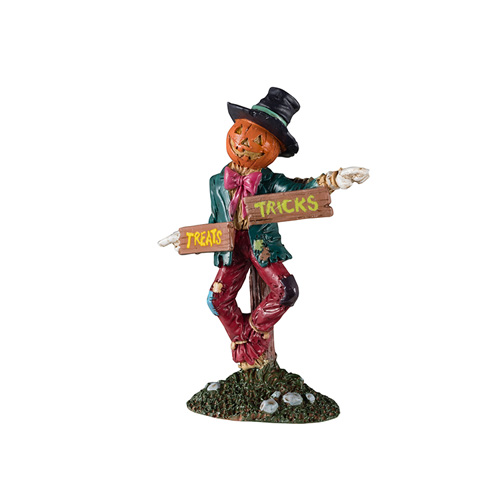 Description: Amidst the autumn twilight, an uncanny scarecrow stands in the middle of Spooky Town, looming horridly. He prays on innocent passers-by to cast his vile cast on. In one hand, he holds a sign pointing to 'tricks' and the other one towards 'treats'. Which one will you choose? Careful though, he may be using one of his own tricks and misdirecting you!