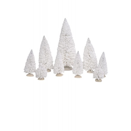 Set of 9 assorted sized White evergreen trees.