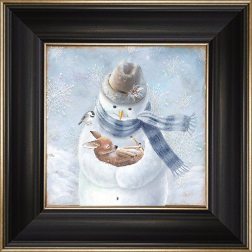 The Fawn sleeps calmly in the snowmans soft arms. Framed. 6 x 6" Materials: Wood Mounted Canvas Dimensions: 6 x 6