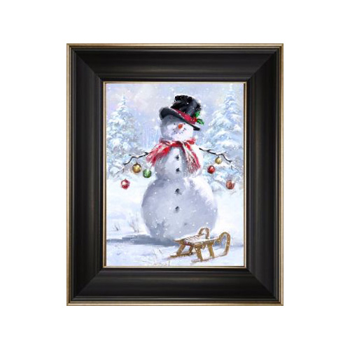 This snowman is very well decorated for the season! Framed. 6 x8" Materials: Wood Mounted Canvas Dimensions: 6 x 8"