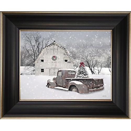 The faded red truck doesn't deliver trees but proudly lights up the barn with the glow of the Christmas Tree lights. Framed. 6 x 8"